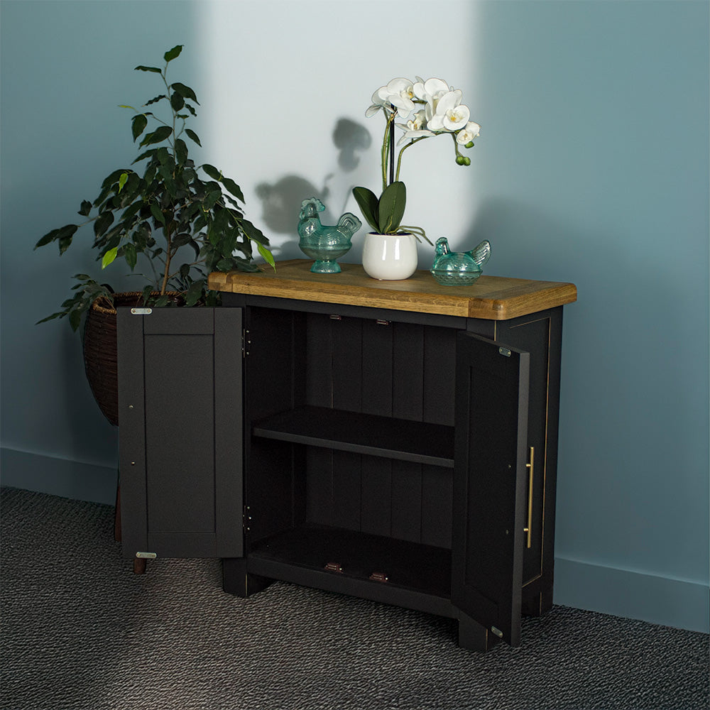 The Cascais Oak-Top Small Sideboard offers just the right amount of extra storage, wrapped in a bold, modern design. With a moody black-painted pine body, natural American oak top, and bronze handles for a touch of polish, this sideboard quietly draws the eye without taking over the room.