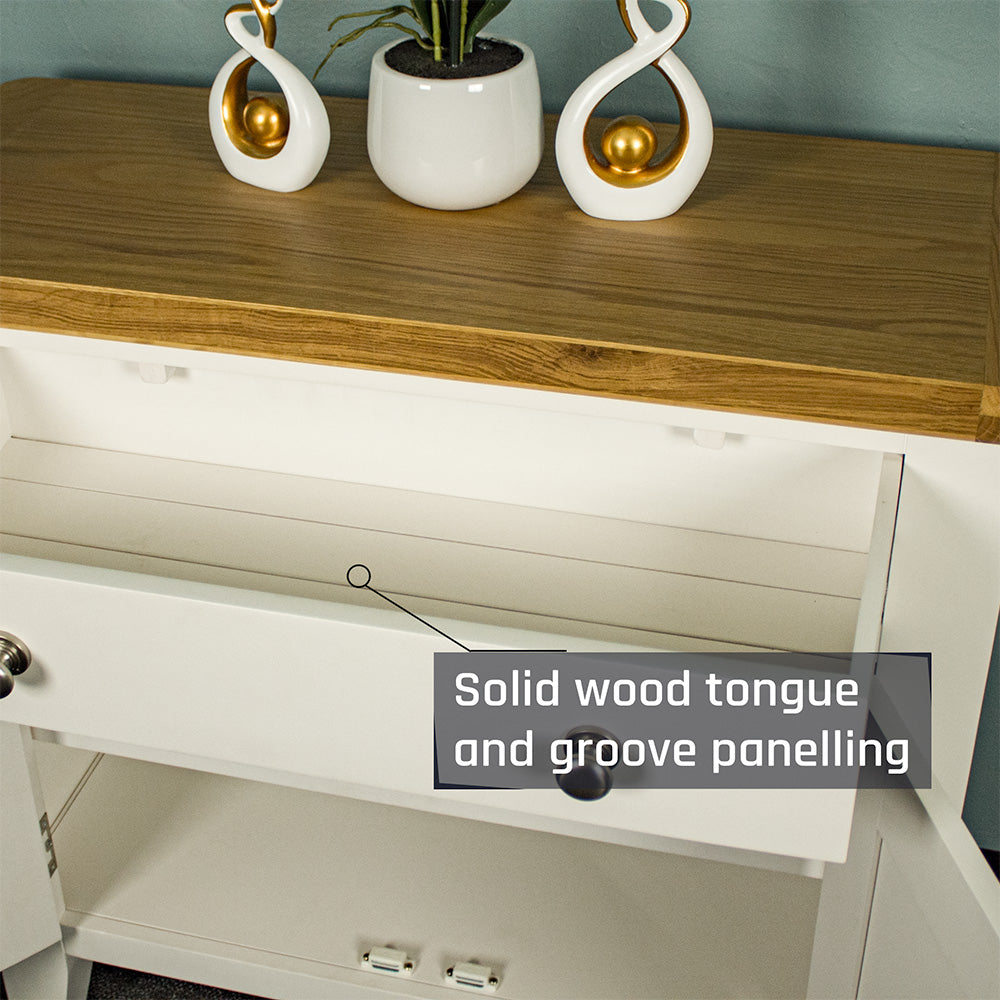 From keeping tucked away that special cutlery and dinnerware to displaying your favourite ornaments and photo frames, the Tasmania Oak Top Buffet is sure to stun with its modern look and robust build quality! With its tongue-and-groove back panelling, this unit is ready to hold up even the heftiest of decorative vases without breaking a sweat!