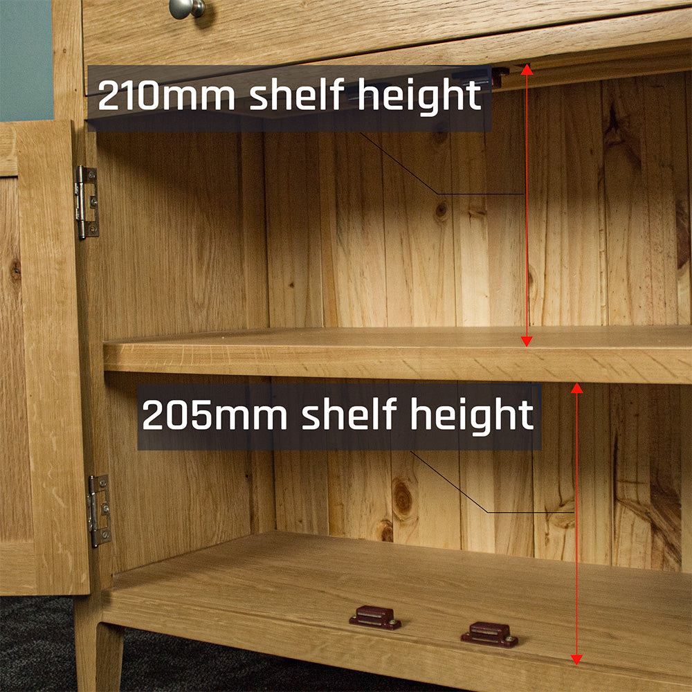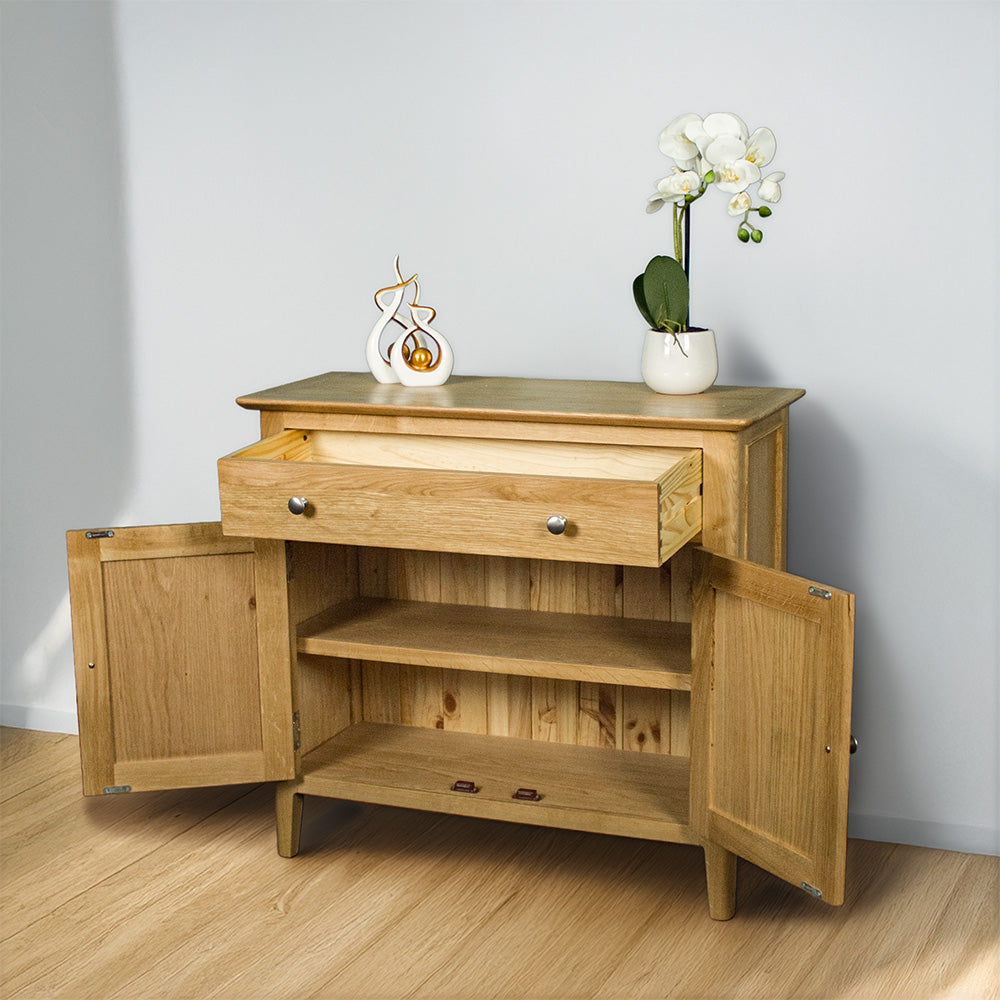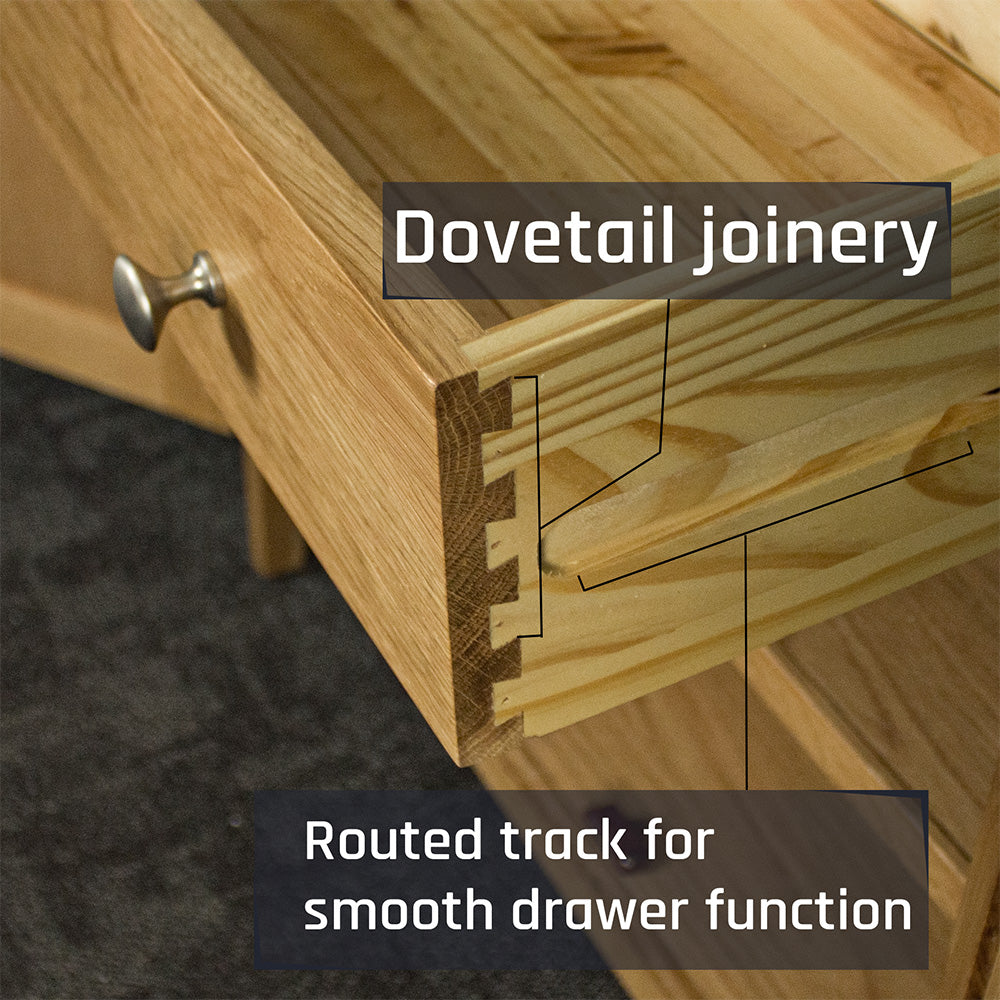 In the living room as the host of all your entertainment for the evening, or in the hallway as the home for the wi-fi router and bowl of keys, the simple traditional styling of the Victoria Small Oak Sideboard is sure to stand out no matter where it's placed. The top drawer also features a routed groove for runners, ensuring it opens smoothly every time you open it.