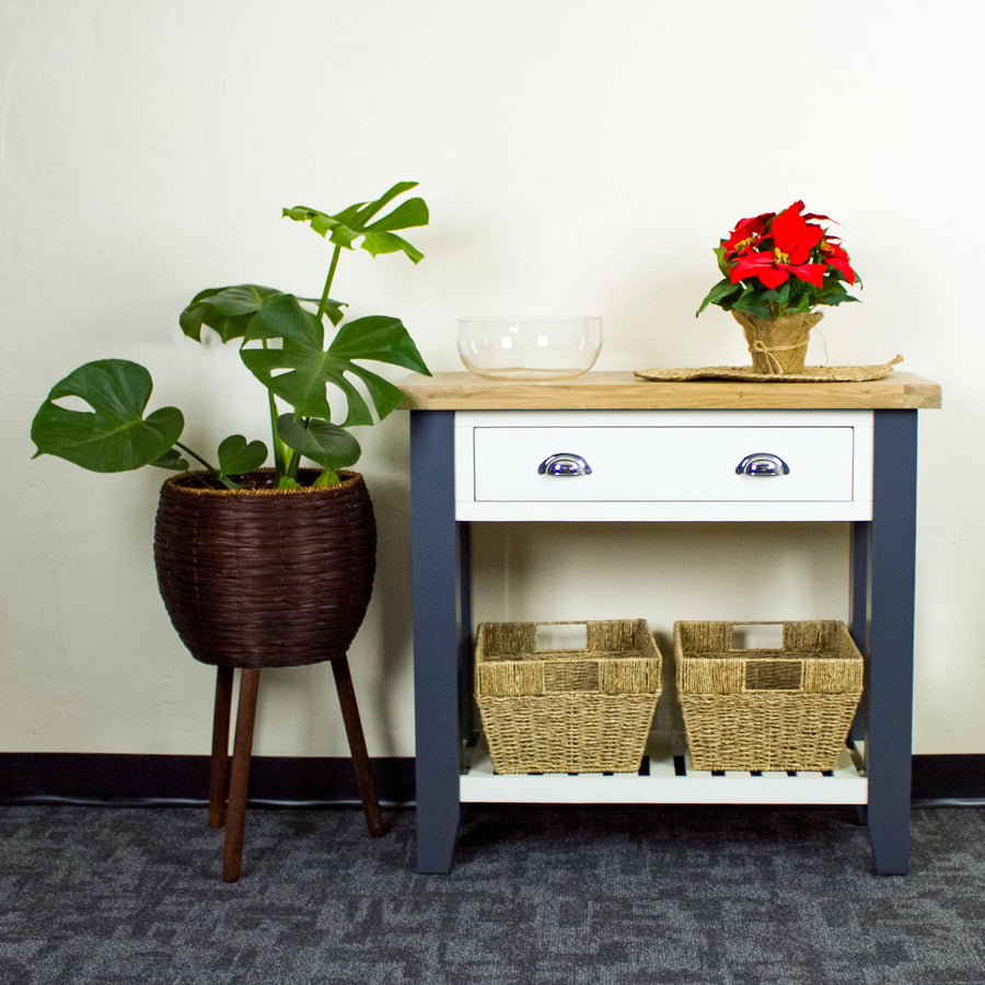 Made with a New Zealand pine build with an American oak top, the Titus Hall Table blends the pine's lightweight qualities with the oak's sturdiness to make a unit designed to last. With in-built natural runners in the drawer alongside chrome-cup handles and legs attached via strong bolts, this units build quality ensures that it doesn't just bring along great looks. This build quality even extends to the baskets with their steel wire framing ensuring they won't ever get bent out of shape.
