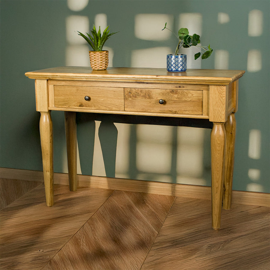 The front of the Loire Oak Hall Table with its drawers open. There are two blue glass ornaments on top with a pot of white flowers in between. There is a free standing potted plant next to the console table.