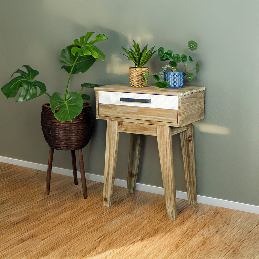 The front of the Monterey Recycled Pine Hall Table with its drawers open. There are two potted plants on top with two blue glass ornaments in the middle. There is a free standing potted plant next to it.