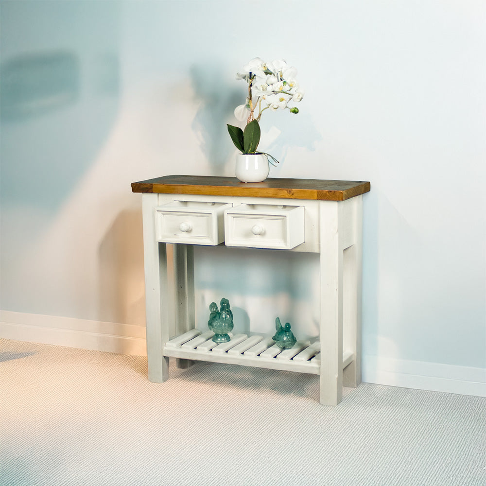 White Alton 2 Drawer Pine Hall Table with a rimu stained top. There are two potted plants on the top and a bouquet of flowers in the middle.