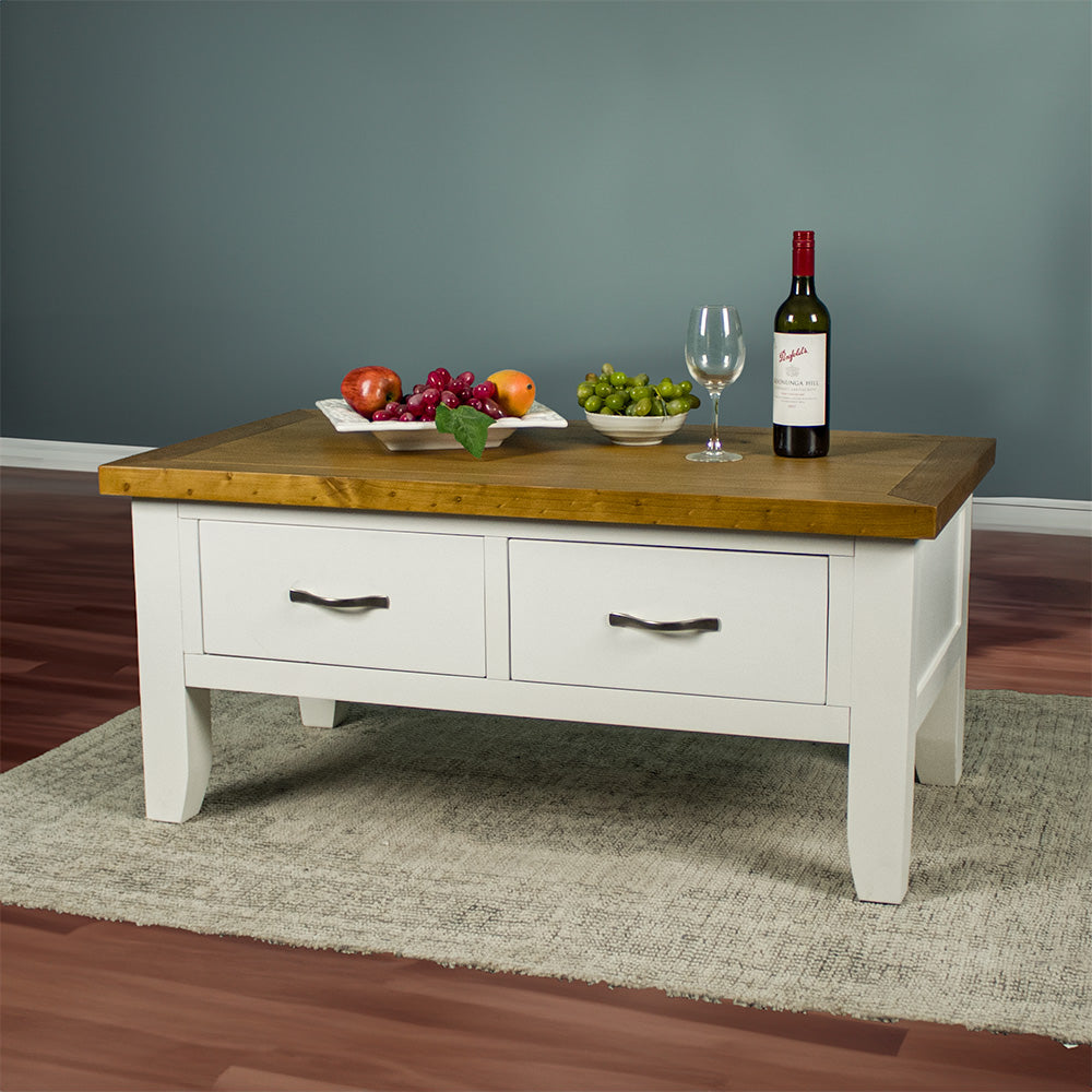 The Felixstowe Coffee Table brings a traditional charm into the heart of your living space. With its clean white base, natural pine top and dual-access drawers, it’s a versatile piece that’s ready for everything from morning coffee to weekend board games.
