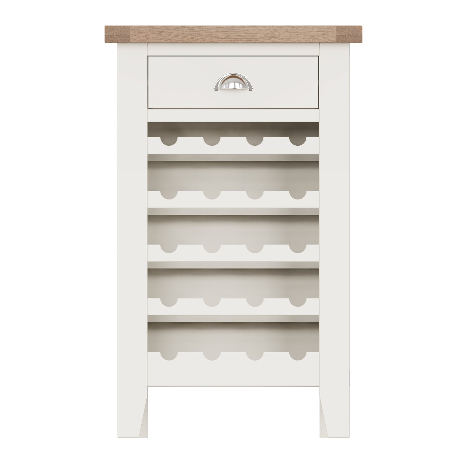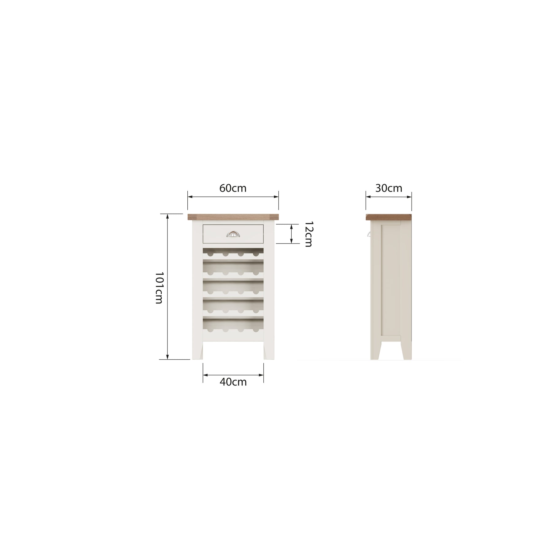 With an Oak top and painted pine body, the Titus Wine Cabinet brings an eye-catching two-tone looking into any living or dining room! The shelving for the wine bottles is strongly braced to be able to host even the heaviest of wine bottles, while the drawer above utilizes guided runners and a built in-stopper to ensure the contents within don't fall out unexpectedly.