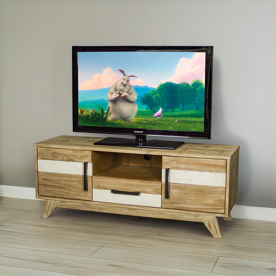 The front of the Mars Medium TV Unit with its drawers open. There is a TV on top, with a gaming console and a DVD player in the two shelves below.