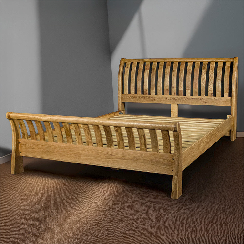 The Vienna Oak King Sleigh Bed brings old-world drama into the modern home, without tipping into theatre. Crafted from solid American oak, its gently arched headboard and raised footboard curve just enough to catch the eye and cradle the night.